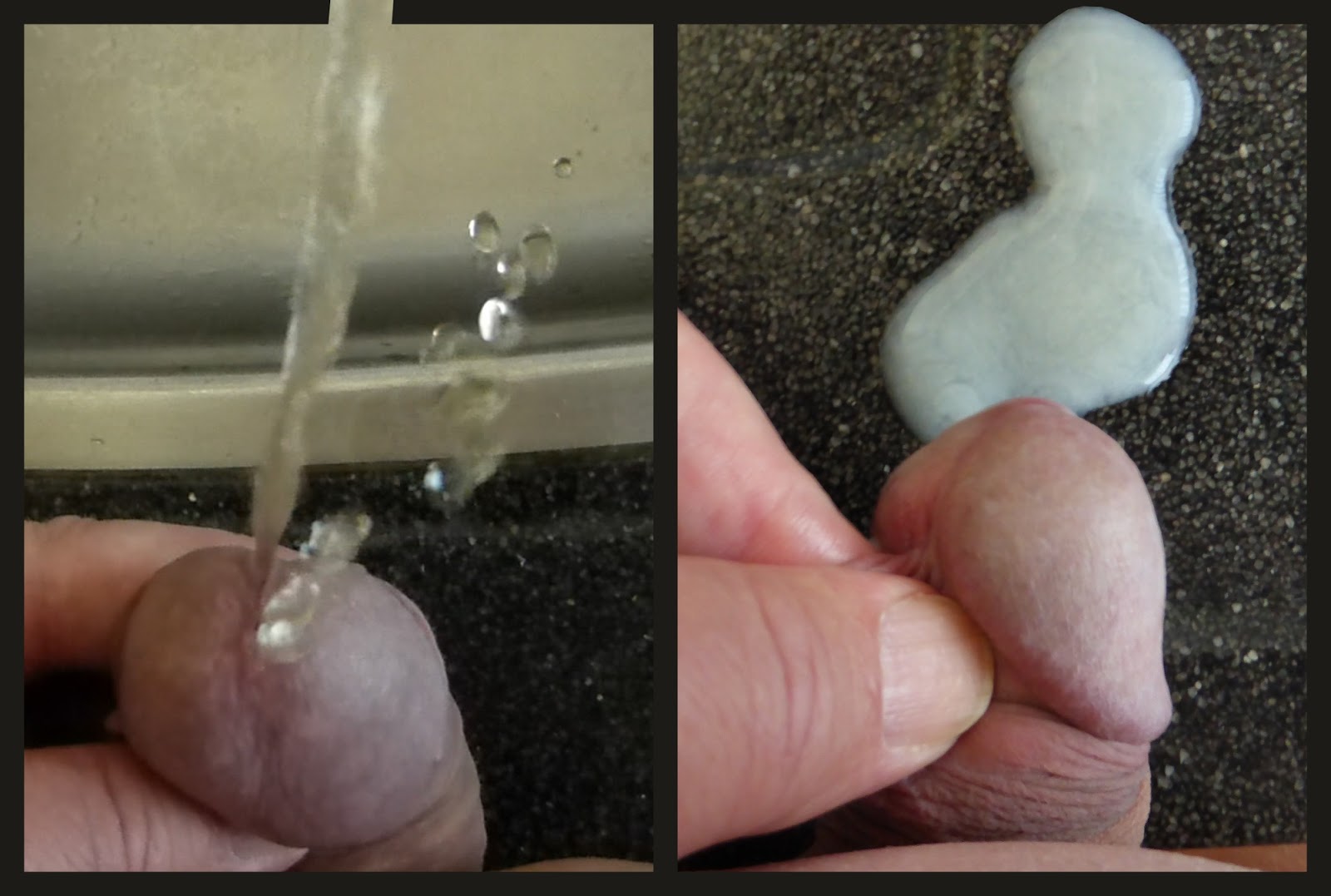 Na een poosje masturberen komt al snel het heerlijke klaarkomgevoel op gang met soms (heel) veel voorvocht. Zoals te zien is op de eerste foto. Al naar gelang de duur van de masturbatiesessie komt er een moment dat er geplast moet worden. Wat te zien is op het eerste filmpje. Masto moest zich behoorlijk inhouden om niet de lens van de camera te raken.